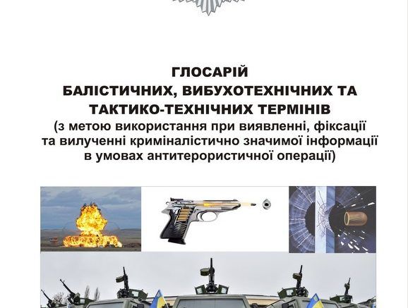 Глосарій (спеціалізований словник) балістичних та вибухотехнічних термінів призначений для надання допомоги працівникам правоохоронних органів під час підготовки та проведення слідчих (розшукових) дій за матеріалами кримінальних проваджень в умовах антитерористичної операції.